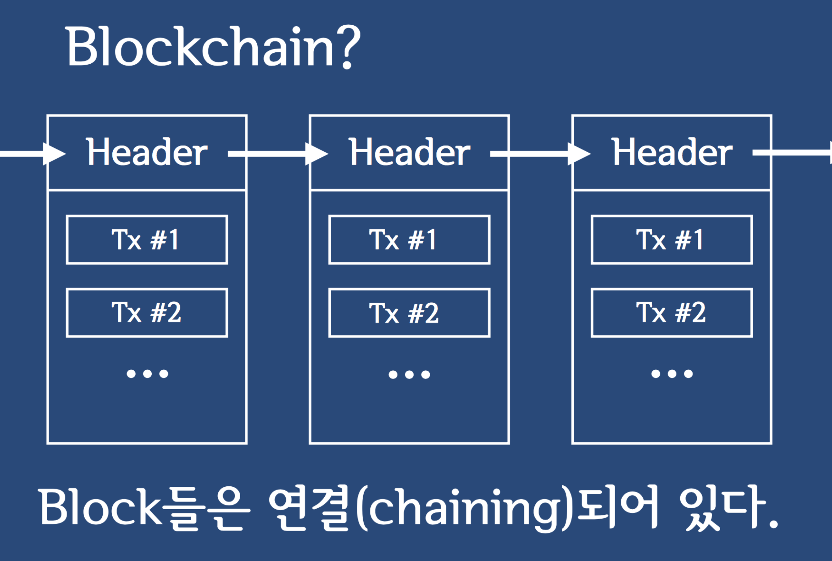 -> 블록체인이란, 아래 그림처럼 각 헤더 + 트랜잭션을 포함한 것 하나하나를 블록으로 서로 연결되어있다.