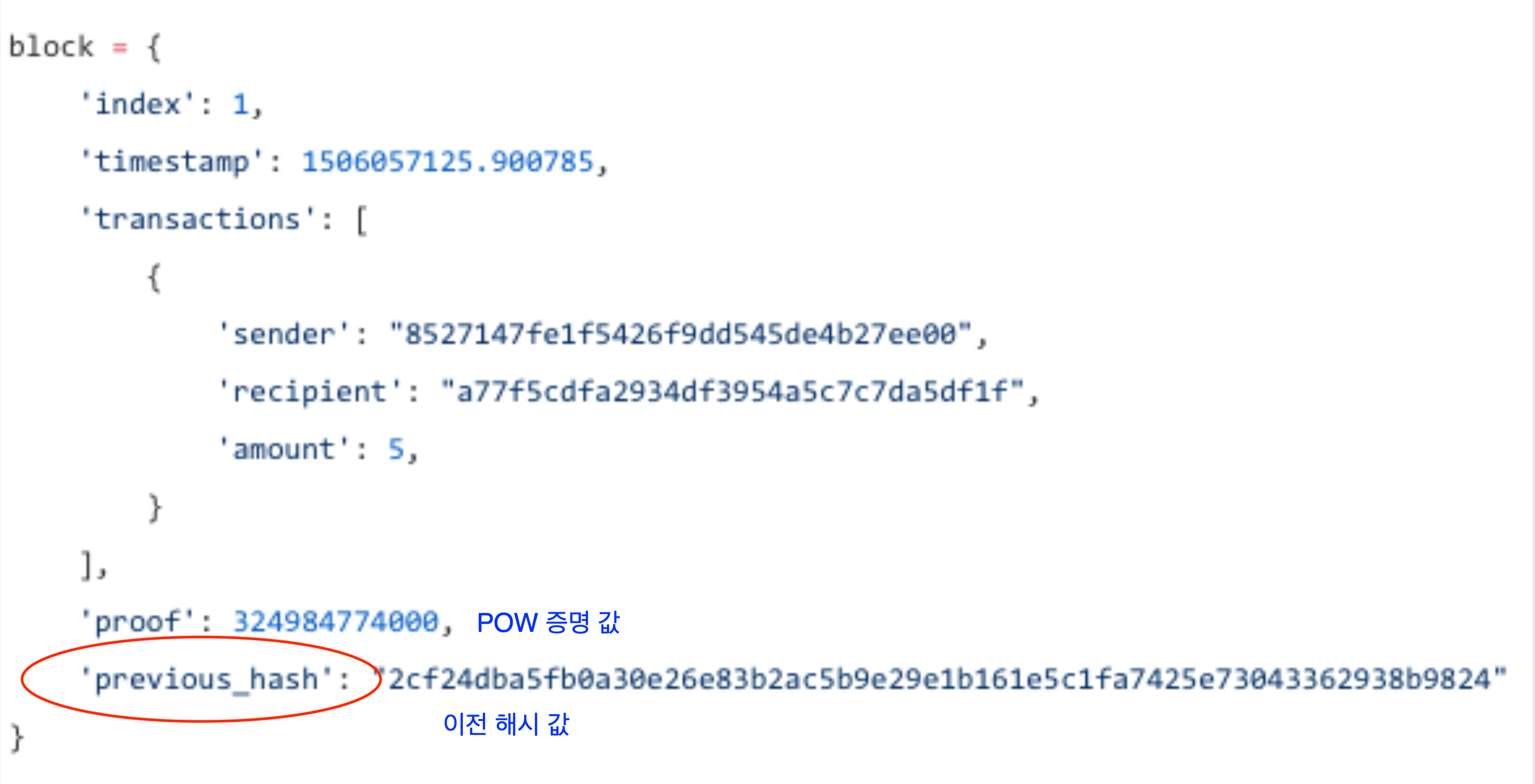 암호화폐의 전송이 이루어지면 -> 상대방은 이를 받는다. 그런데 트랜잭션이 정상적인 트랜잭션인지 먼저 검증절차를 거쳐야 할 것이므로, 이는 "전체 블록체인 네트워크(ex: 비트코인 플랫폼)"으로 넘어간다. 이를 채굴자들은 검증을 진행하고 -> 검증이 종료된다면 블록에 포함되고 수신자가 코인을 받는 형식이다. 다음 트랜잭션은 , 코드로 살펴보면 다음과 같이 생겼다. index(인덱스번호), timestamp(시간), transaction의 sender(송신자), recipient(수신자), amount(총량), proof(POW증명값), previous_hash(이전 해시값)이 포함된다.