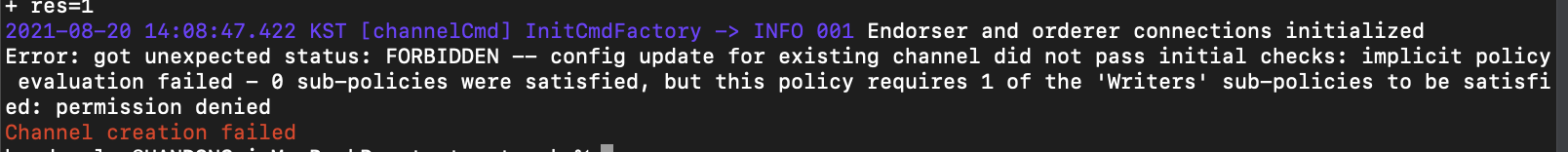 [Error] got unexpected status: FORBIDDEN -- config update for existing channel did not pass initial checks: implicit policy evaluation failed - 0 sub-policies were satisfied, but this policy requires 1 of the 'Writers' sub-policies to be satisfied: perm..