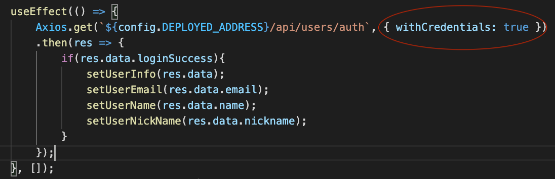 모든 Cookie 송수신 관련 API에는 axios 또는 fetch에 {withcredentials : true} 옵션을 삽입해준 뒤, 쿠키를 전송하면 정상적으로 전송된다. (미들웨어에서 cookie를 가져와서 하는 최종 컨트롤러에도 모두 밖아야 정상 동작한다.)