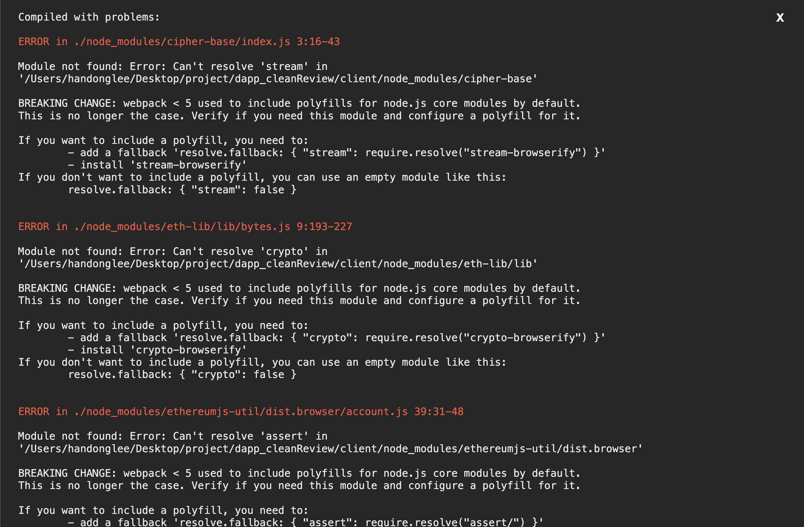 이제 App.js에서 import Web3 from "web3"를 한번해보자. 에러가 왕창 쏟아진다.