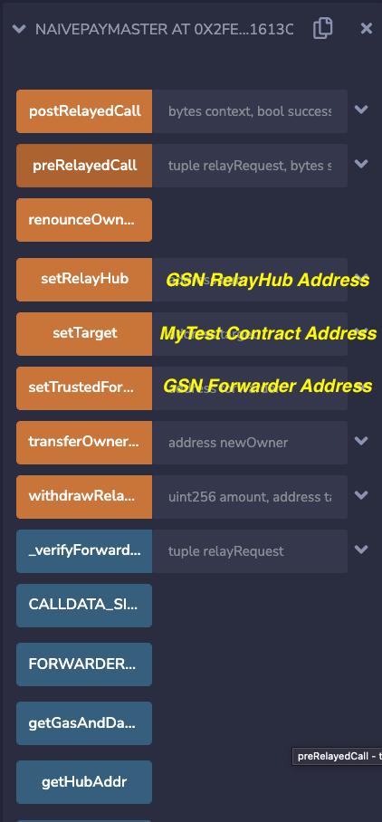아래 그림을 참조하여 RelayHub -> TrustForwarder -> setTarget 순으로 알맞은 주소를 입력해 컨트렉트를 호출한다.