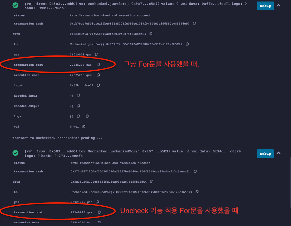 **그래서, 확실한 값에 대하여 오버플로우 검사를 수행하지 않으면 가스비용 최적화에 도움이 된다.