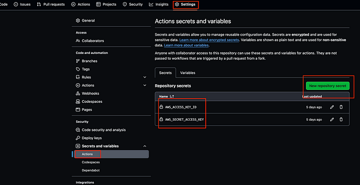 - Github Action에가서 위에 생성한 IAM으로 Secret을 생성한다.