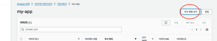 - 생성한 ECR 안에 들어가면, 푸시 명령 보기 로 명령어를 확인할 수 있다.