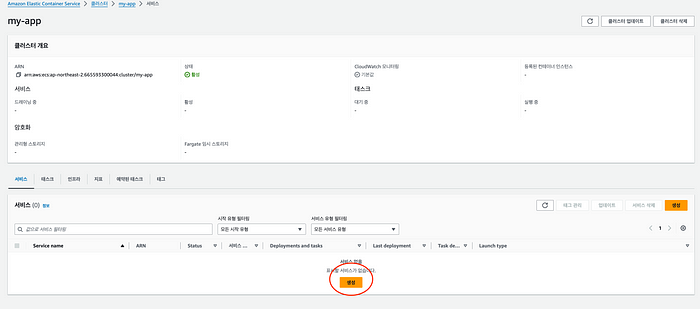 생성한 클러스터에 접속해 서비스 부분의 생성 버튼을 눌러 생성하면된다.