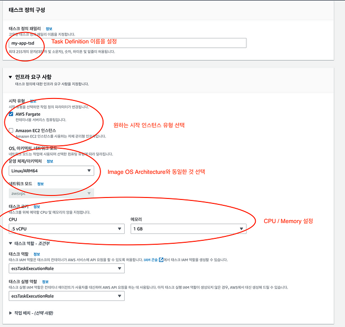 - Task Definition : 컨테이너 애플리케이션 명세서 (JSON)로 사용할 이미지 지정과, Container의 CPU & Memory 설정 등을 할 수 있다. 여러 컨테이너를 실행할 수 있다.