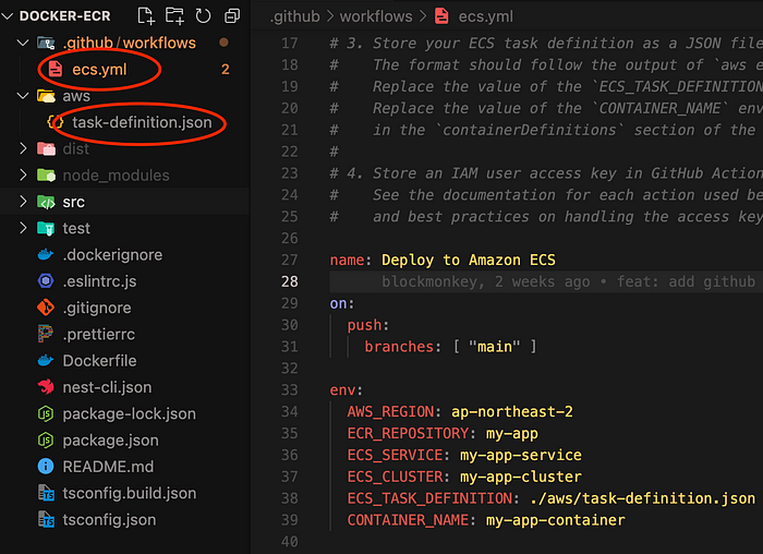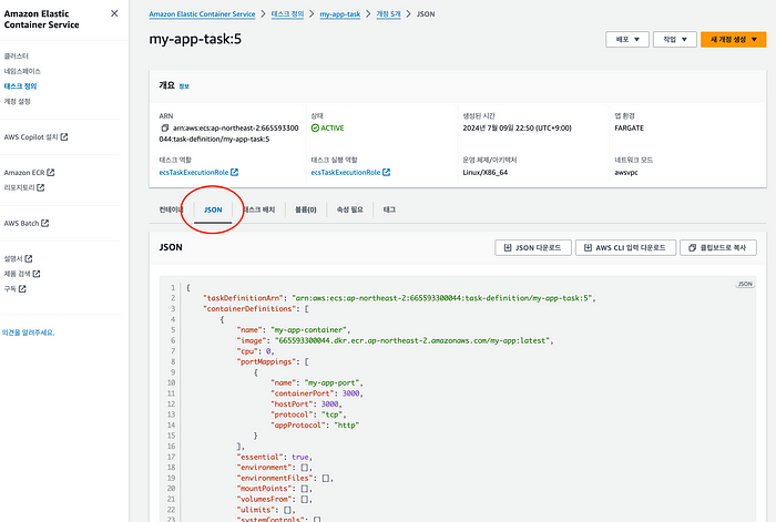 Task Definition File이 필요하다. Task Definition의 경우 테스크 정의 -> JSON에서 확인이 가능하다. 다운받고 프로젝트 폴더에 포함시켜야 한다.